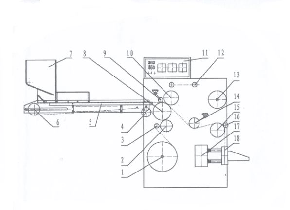 1.PVC硬片 2.吸塑加熱輥 3.吸塑小導(dǎo)輥 4.中導(dǎo)輥 5.上料平臺 6.定導(dǎo)輥 7.上料器 8.吸塑模具輥 9.模具壓輥 10.熱風(fēng)加熱輥 11.電控箱 12.小導(dǎo)輥 13.鋁箔 14.擺動輥 15.進(jìn)給模具輥 16.進(jìn)給壓輥 17.沖裁箱體 18.沖裁(沖刀)
