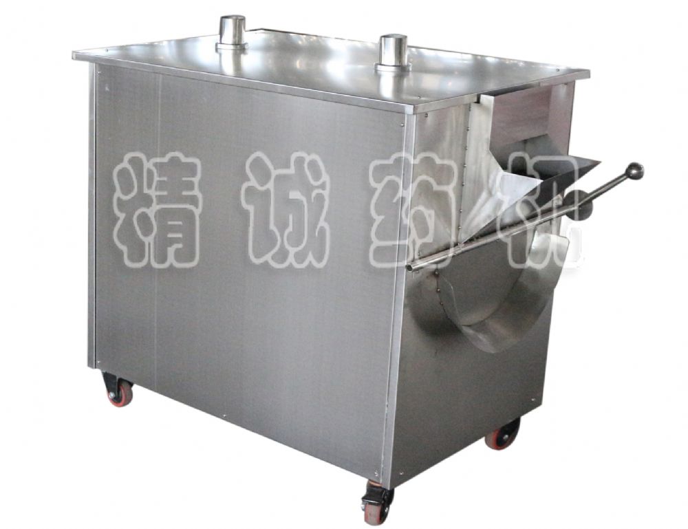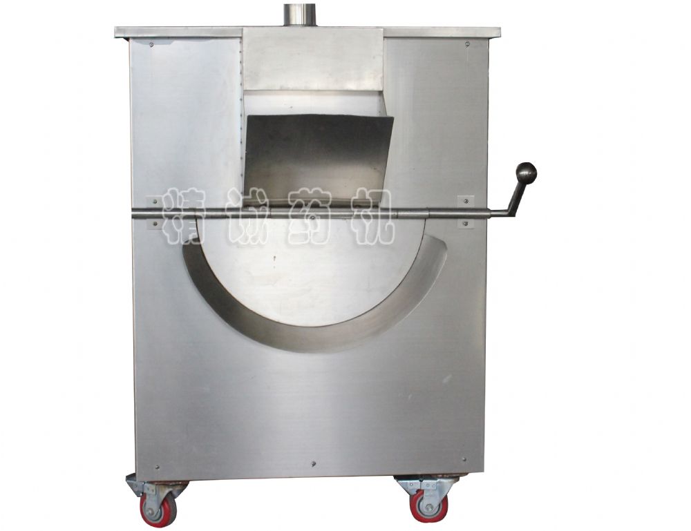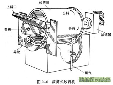 滾筒式炒藥機(jī) 由炒藥滾筒、動力系統(tǒng)及熱源等部件組成,有的還附有加料裝置的出料裝置,見圖2-6所示。操作時(shí),將藥材通過筒口加入,蓋如筒蓋板(為了散熱常在蓋板上留有散熱孔)。加熱后,開動滾筒,借動力裝置滾筒做順時(shí)針方向轉(zhuǎn)動。使筒壁均勻受熱。當(dāng)藥材炒到規(guī)定程度時(shí),打開蓋板,按動是鈕,使?jié)L筒反向旋轉(zhuǎn),即可使藥材由出料口傾出。滾筒式炒藥機(jī)的熱源可用爐火,也可用電爐可煤氣。