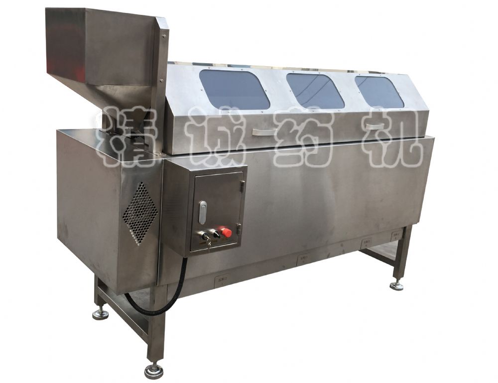 該機可單機使用也可與制丸機和提升機配套使用,提升機將成品藥丸提升后經(jīng)溜槽進入旋轉的滾筒篩內,兩節(jié)滾筒篩在主動摩擦膠輪的帶動下,順時針旋轉,分別選出符合要求的各種丸劑。在篩選的過程中會出現(xiàn)丸劑直徑正好與篩孔大小一致的情況,丸劑夾在篩孔上,這時安裝在滾筒篩側邊的滾刷或硅膠壓輥能將藥丸擠出。